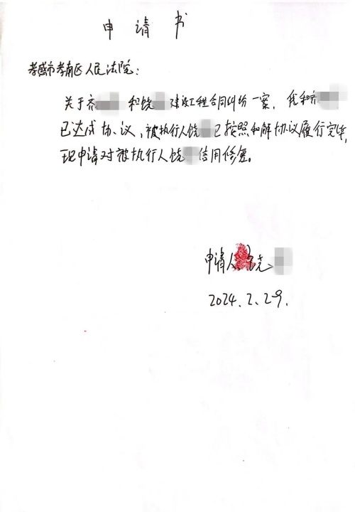 3月4日,孝南区法院在一宗建设工程合同纠纷执行案件中,为某小微企业出具了2024年首份信用修复证明书,帮助该企业重返经营跑道。