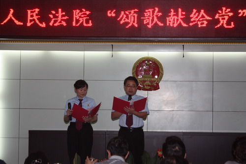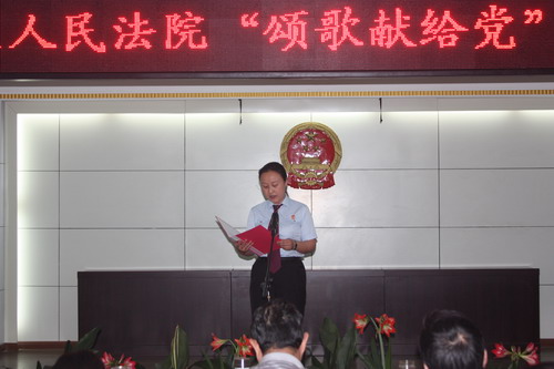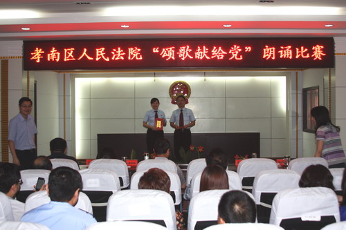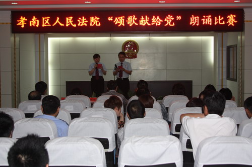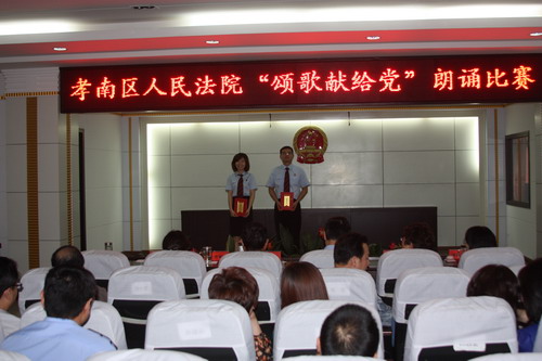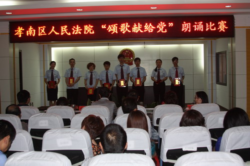 为了迎接十八大,进一步激发全院干警热爱党、坚信党、忠于党、紧跟党的理念,展示法院干警听党话,跟党走,努力在本职岗位上为党旗增辉添彩的精神风貌。孝南区法院结合主题实践教育活动和工作实际,突出法官职业特色,举办以“颂歌献给党”为主题的诗歌朗诵比赛,全院干警踊跃报名,共有16名选手参加了比赛,表达对党的祝福和热爱。