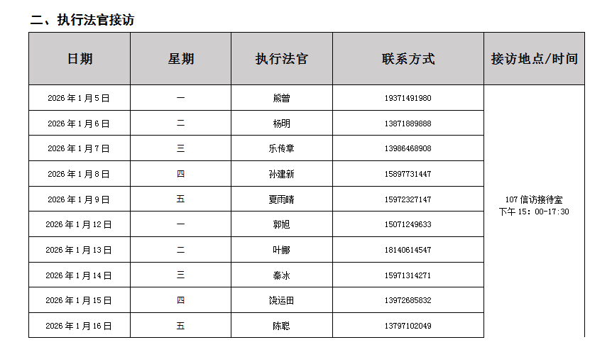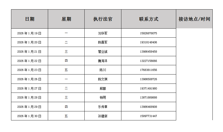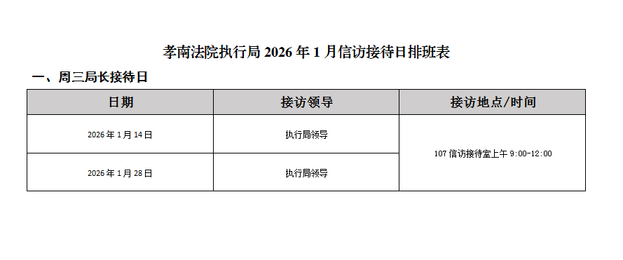 为切实提升人民群众对执行工作的满意度和获得感,及时发现并解决人民群众在执行领域急难愁盼问题,畅通案件当事人诉求反映渠道,强化执行公开力度,现将孝南区人民法院执行局2026年1月执行信访接待日排班表公示如下:
